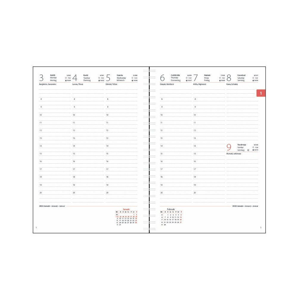 • Naptár beosztás: Heti (1 hét 2 oldalon)
